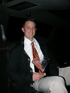 In the limo after dinner, holding his award.