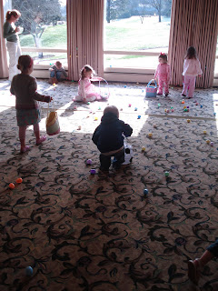 On Saturday (day before Easter) Daddy T and Carson went with Gma & Gpa Tompkins and Michelle to an Easter egg hunt at a country club in town. (I stayed home to work on my paper–did I mention it’s now done?) Here’s some pics of Carson’s first hunt.