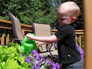 Here’s some pics of Carson participating in one of his favorite helping activities at Gma Jo-Jo’s. She’s got a bunch of gorgeous flowers in their yard, and last summer he began the routine of helping her water them. He even has his own watering pot. As you can see, he takes it quite seriously!
