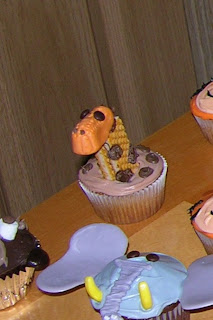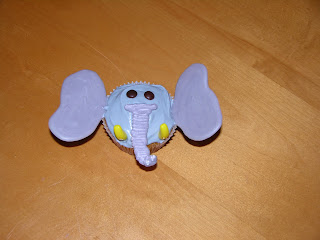 I did the ears and trunk with melting candy wafers like I used for the butterfly wings. By the time the pictures were taken and it was time to eat the cupcakes, most of the ears had broken off! The tusks are banana runts. 🙂