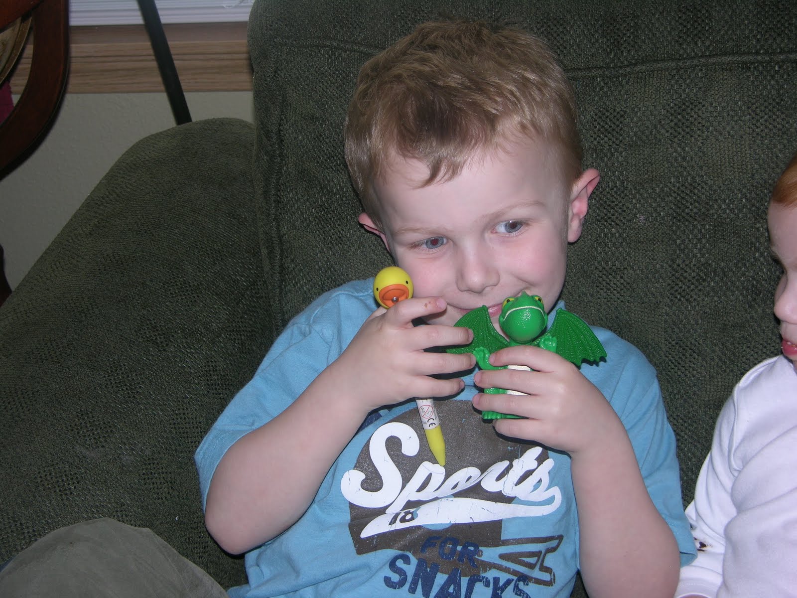 Carson: This is the best day ever! [Editor’s note: that was an actual quote.] Jojo got me a dragon in my Happy Meal AND a pen that has a light and quacks! I wonder how many times I can make this duck quack before my mom rips it out of my hands and threatens to throw it in the garbage again?