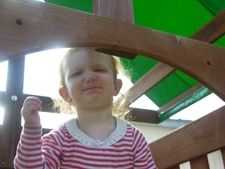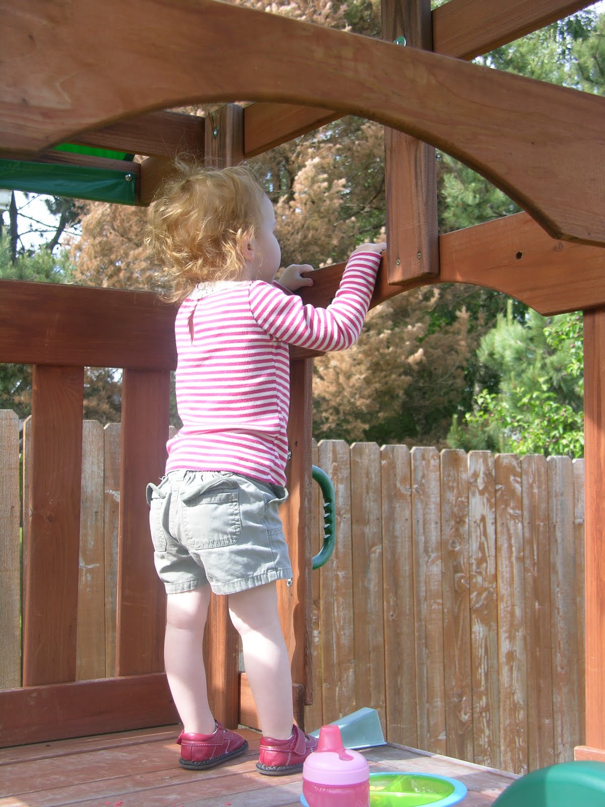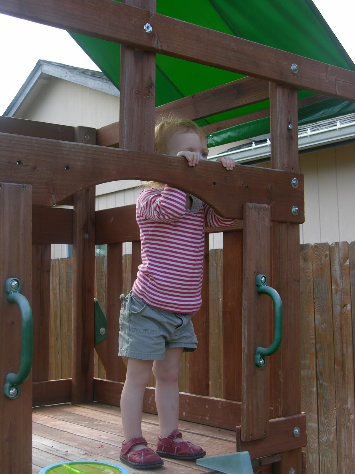 We have some really great neighbors behind our house. They have two elementary aged girls and a trampoline. Both of MY kids are enamored of the “dirls” as Carson calls them. This particular day, I came out to find Sydney just watching the action on the trampoline. She literally stayed up here in this spot for about 10 minutes–just peeking over the rail of the playset.
