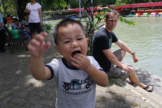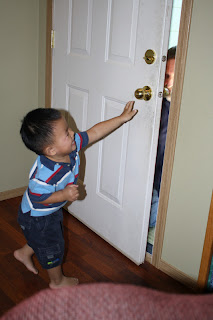 Asher babbles a lot, and I wish I knew more of what he was saying, to know if it is actually an attempt at a Thai word. We know he says “kai” which is chicken, and to him it means “eat,” and he says “naam” which is water and “mae” which is mom for his foster mom. š But he’s picking up a few English words and is getting good at mimicking our voices. He called Sydney “NEE”, he calls Mommy “MEE” and Daddy “DEE.” So far he’s still working on the hard “K” sound in Carson. He says Buh-bye, Uh-oh, and NO.