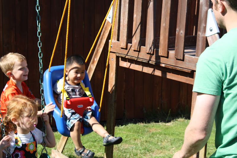 It’s interesting to me that I had given so much thought and prayer into the emotionally intense grieving time in Thailand, that I honestly hadn’t given a lot of brain time to pondering this in-between time at home. After the deep sadness is gone, as the jetlag fades, but before our souls are truly bonded as son/parent and brother/sibling. Also–it’s one thing to say it, but another thing to live the truth that attachment is very much a 2-way street. I was so worried about HIS attachment to US, that I hadn’t thought about OUR attachment to HIM. I’m not indicating that anything is wrong, or that we don’t love him madly, it’s just that we just met him! We don’t know each other well yet. He’s been in our home barely seven days! To be perfectly honest, sometimes it feels like we are caring for someone else’s child and they’ll be by to pick him up soon. I’m sure he feels the same way about us. “Is this trip over yet?!” But then we have special moments where we truly feel the longing and the waiting that has come to fruition in this child, and his mere presence makes us feel so complete. He IS our son, and we never have to wait for him again! We are all making great strides towards attachment; we are pouring on the physical affection and he is learning to reciprocate, even if that is just a mimicking act right now, not one that is initiated by him. I don’t know if I ever clarified, but somewhere around those 3 long time-killing days in Thailand, Asher started to prefer Mommy. I think it had to do with the fact that Daddy was having to be the disciplinarian a bit more. He still is fond of Trent, but especially at night he wants me there. Not necessarily holding him, but THERE. He’ll also walk up and wrap his hands around our legs, and often during the day comes and holds his arms up for me to hold him, and I sneak in some hugs and kisses. He also kisses us all on the cheek now. Each day, sometimes each hour, we see and feel that bond growing closer.
