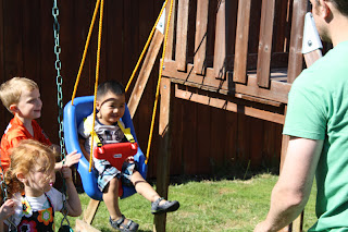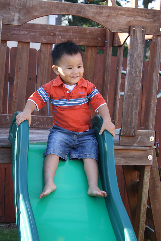 I’m LOVING this orange shirt on him! And it seems we’ve waited a lifetime to see him on our backyard slide!