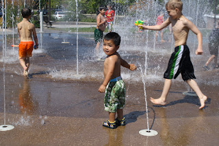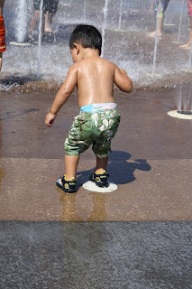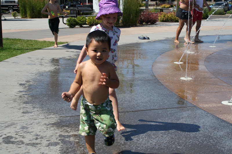 I haven’t been good at grabbing the camera, but here’s some photos from the last couple of weeks. All of the kids really like the splash pads. These concrete fountain/sprinkler designs are the perfect invention for a mom who’s a freakout about drowning. Asher loves any water activities. I’ll have to get a video of him at one of these things. He purposely gets water in his face, then gasps and smiles and flaps his arms wildly! We’ve been in a real pool a few times and he has gone from timid to dangerously fearless! If you don’t hold his hand on the deck, he bolts at a fast clip for the edge of the pool. When we are in there waiting, he doesn’t exactly jump in, he tips over like a fallen tree, head first, just trusting that we’ll catch him. He also LOVES being dunked under the water. LOVES it! Keeps his eyes and mouth wide open in a big smile, then comes back up and immediately says “More! More! More!”
