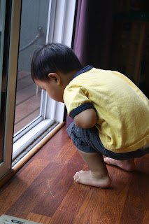 This picture was taken just this morning, and I like the moment it captures. Asher was suddenly quiet and attentive to something, which most often means trouble. But this time he was fascinated by a little spider in our dirty sliding door rail thingy. He watched it for quite a while.